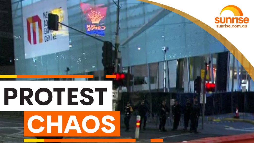 Melbourne Land Forces exposition: Anti-war protest clash with police at Exhibition Centre entrances