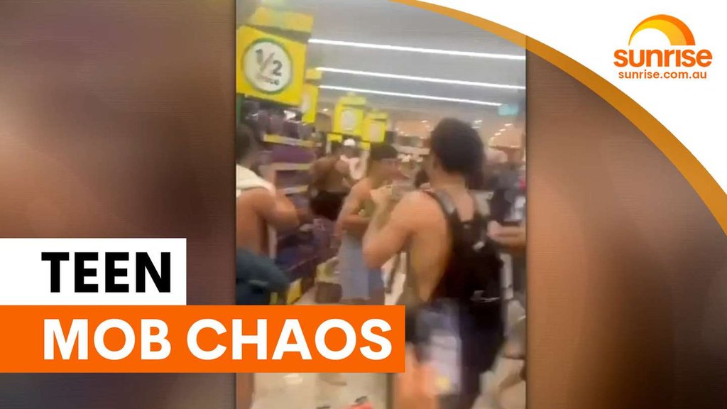 Chaotic footage has emerged as a large group of teenagers ran through a supermarket before a fight broke out at a nearby beach.