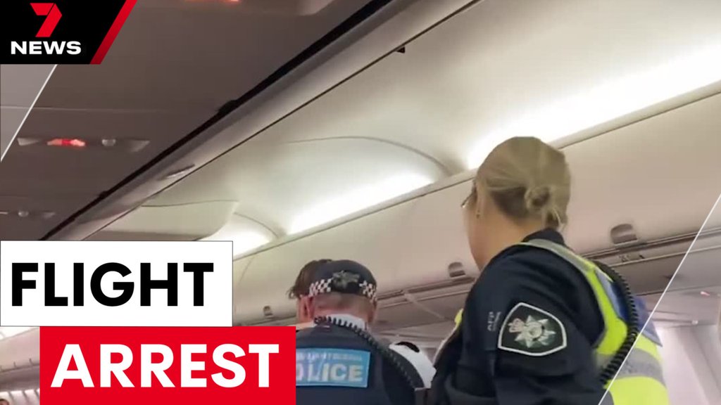Video from the flight obtained by 7NEWS shows the man speaking with three officers — a man and two women — one of whom tells him: “You’re intoxicated, I can smell it.”