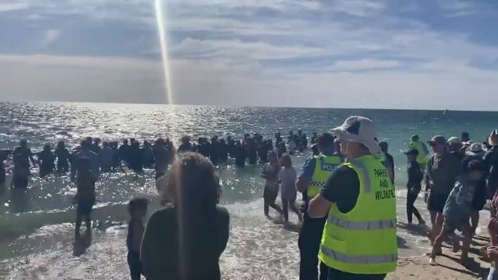 Rescue crews scramble to save pilot whales beached in Marybrook, near Busselton and Dunsborough