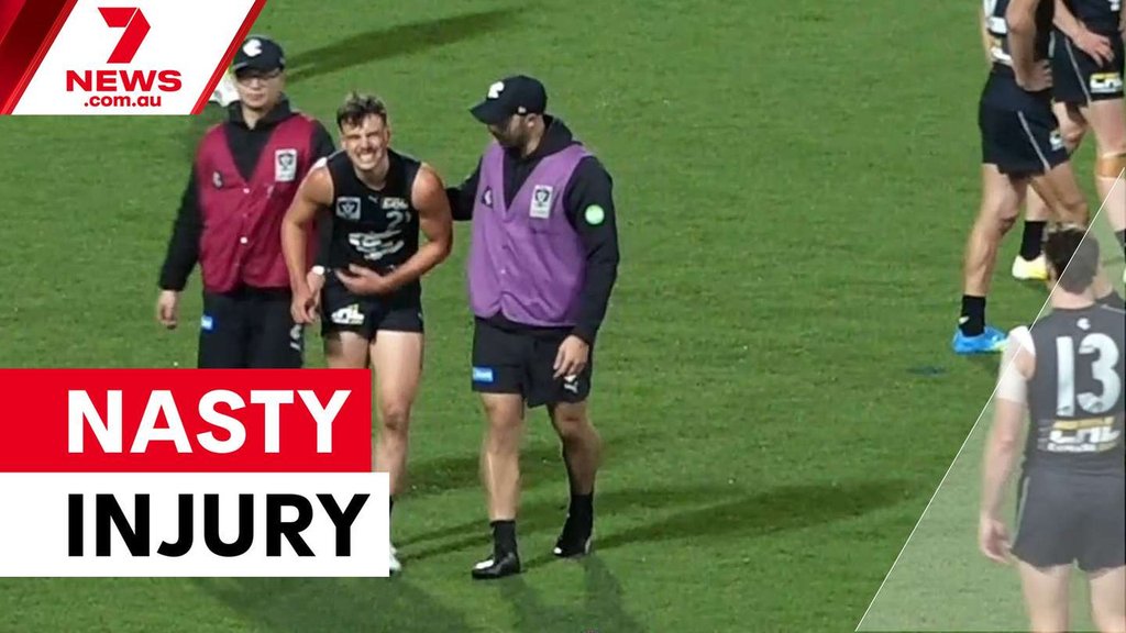 Famous AFL twin Lucas Camporeale is in hospital after an alarming injury in Carlton’s VFL clash with Collingwood at Ikon Park on Friday night.