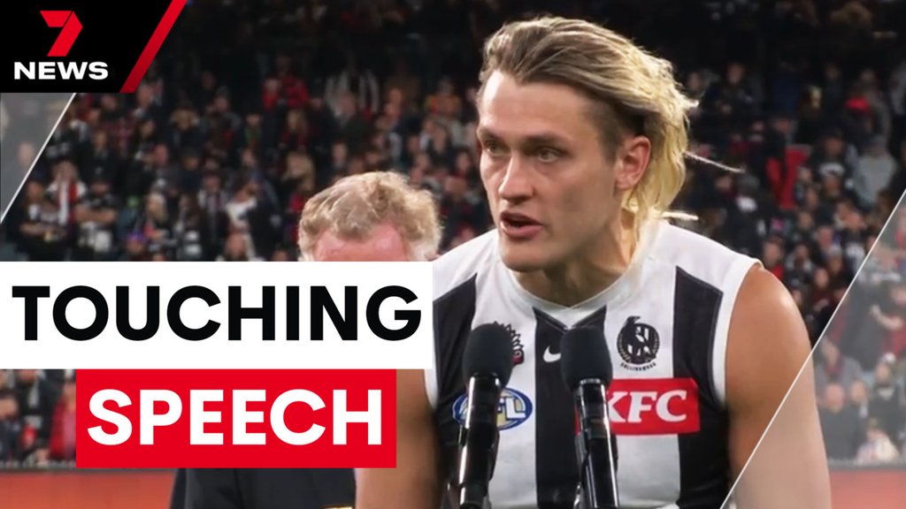 WATCH: Collingwood captain Darcy Moore has been heaped with praise after a touching post-match Anzac Day speech that prompted a huge response from the MCG crowd.
