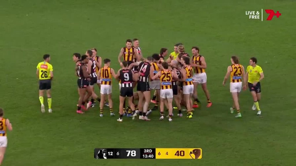 Collingwood players immediately flew the flag for Lipinski, sparking a mini melee, before kicking an easy goal from the goalsquare after a 50m penalty paid.
