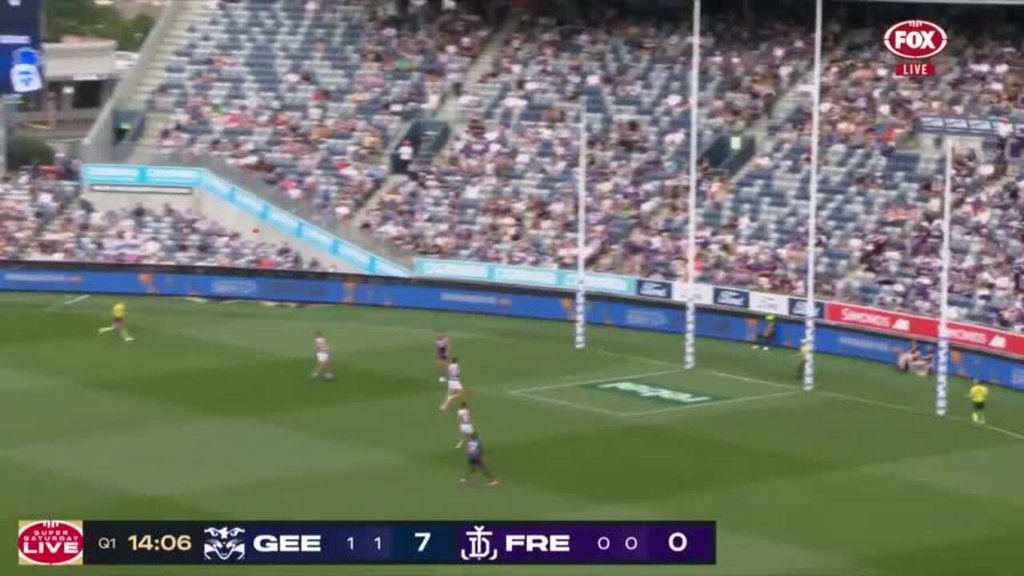 Fremantle have done their best to lock down the Cats’ spearhead but a touch of class sees him reel in a low mark in the pocket.