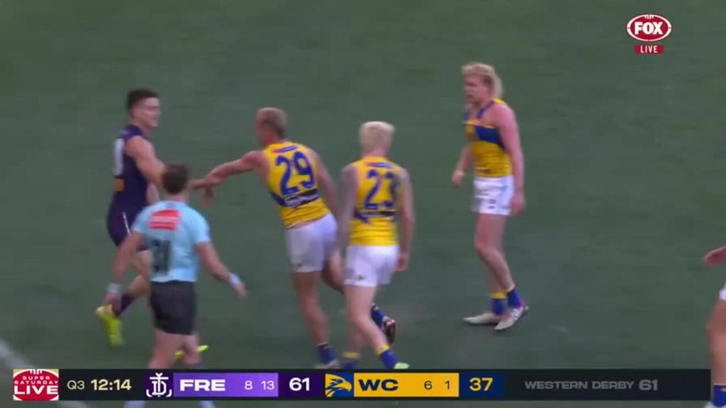 Young kicked his third goal of the day to give Fremantle a 35-point lead but again the Eagles showed fight. Kelly kicked a goal on the siren and the margin was five goals at the final change.