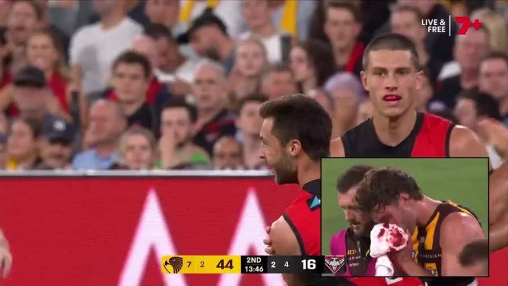 Hawthorn defender Jack Scrimshaw came from the field with blood pouring from his face after a collision with teammate Josh Battle during their AFL clash with Essendon on Friday night.
