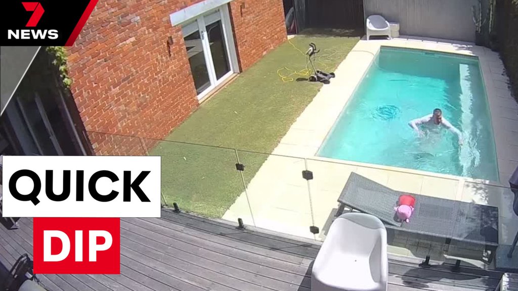 Security camera footage captures AFL great Matthew Richardson in pool mishap
