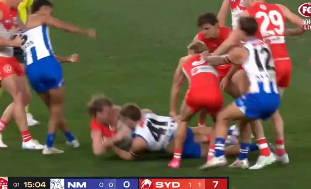 Former teammates Jacob Konstanty and Nick Blakey lit the fuse for an explosive clash in the opening minutes of North Melbourne’s clash against Sydney.