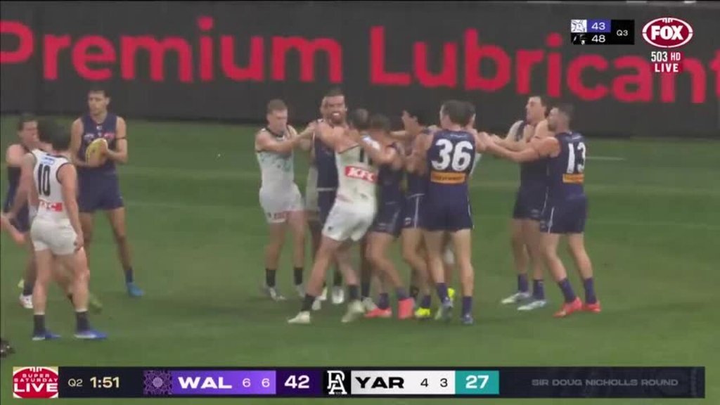 Then came a huge moment as Alex Pearce crashed into Darcy Byrne-Jones as the Power forward attempted to mark. Scuffles ensued as tension rose but the Powe missed with the shot for goal.