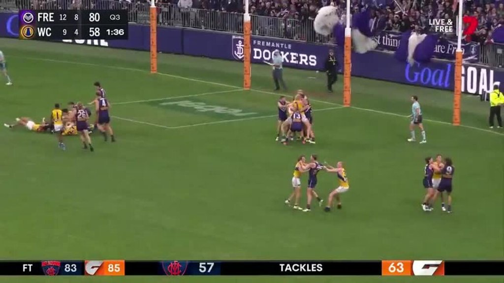 Reid’s battle with star Freo midfielder Andrew Brayshaw got particularly feisty, and a big melee erupted when Reid brought down forward Sam Switkowski off the ball in the third quarter.