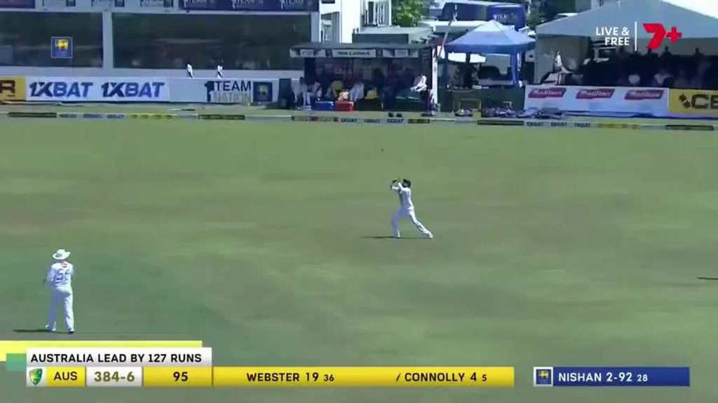 The 21-year-old came to the crease with the Aussies at 6-373 and was nearly out for a golden duck when an absolute peach by Nishan Peiris beat the outside edge.