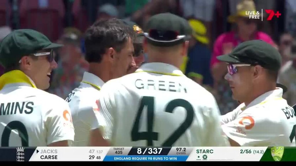 By continuing you agree to our Terms and Privacy Policy.England had just nudged the required target below 100, with three wickets in hand, and were making the home nation nervous, when Mitchell Starc drew the edge of Will Jacks’ bat.