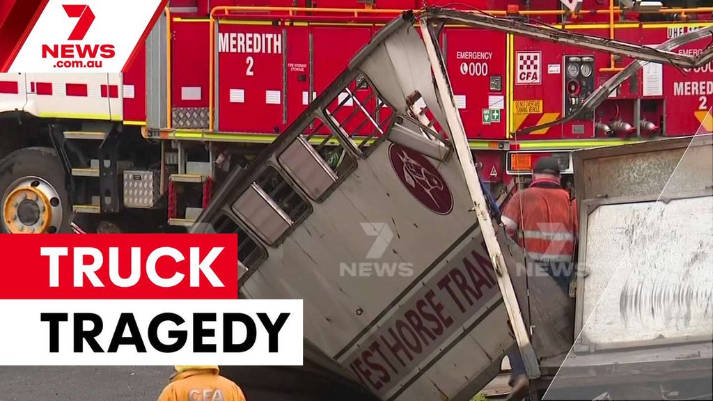 The horse transport truck rolled onto its roof and went over an embankment at a tight bend on Slate Quarry Rd in Meredith, 46km northwest of Geelong on Monday morning.