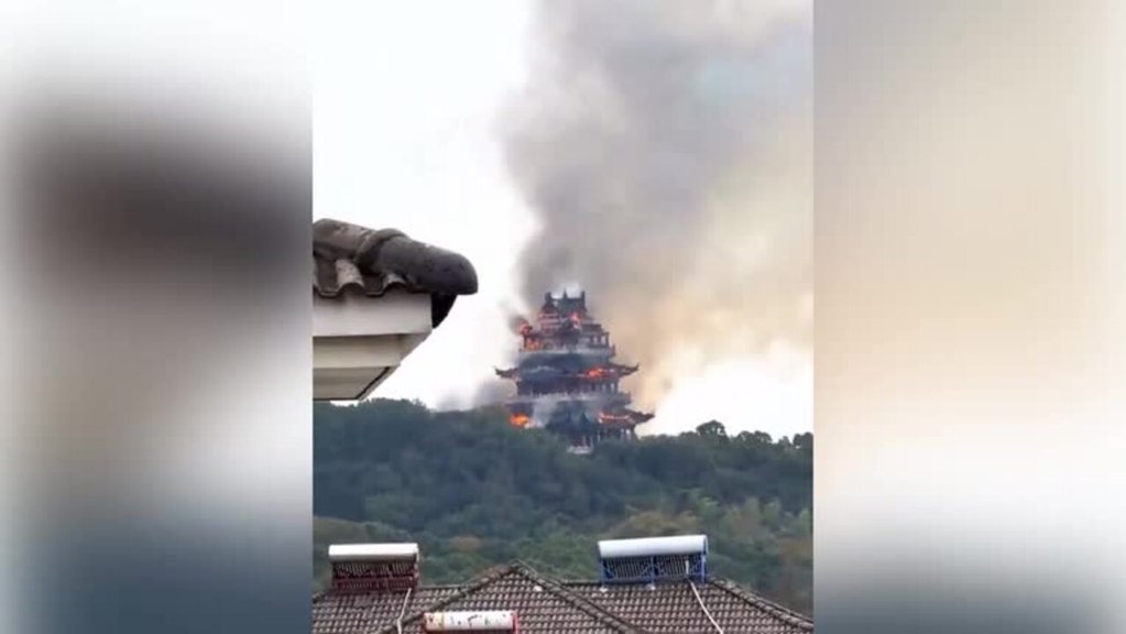 Footage posted across Chinese social media showed flames punching through the three-story structure as thick black smoke swallowed the sky, the blaze engulfing the modern reconstruction commissioned in 2008 and completed in 2009.