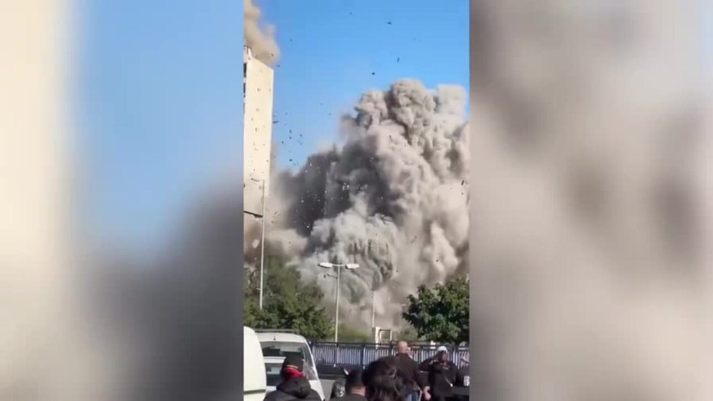 The terrifying moment a 2000lb Israeli bomb levels an apartment building in Beirut has been caught on camera.
